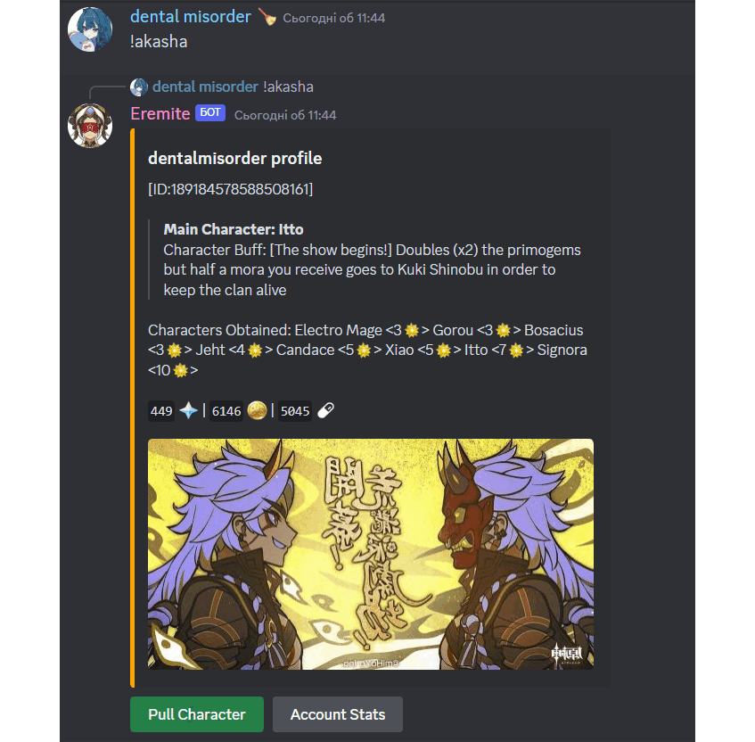 Bot that can gift Welkin Moon (yes, in-game*), pull wishes with custom characters, sacrifice waifus for Primogems, do !daily, !travel across Teyvat and dont forget about Dori at the !shop. Open Sourced. | Docs